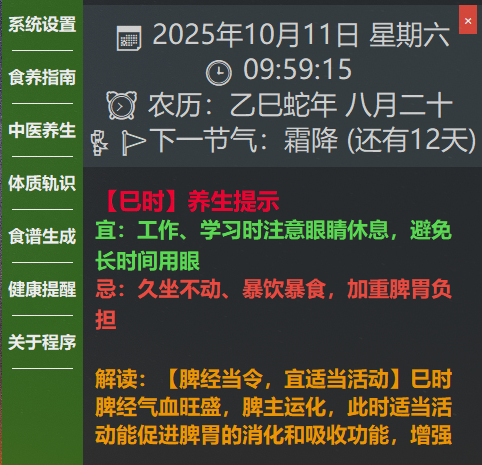 软件主界面上方显示当前时间、日期、星期、农历和节气信息。下方面板显示当前时辰的养生提示,包括“宜”、“忌”和详细解读。