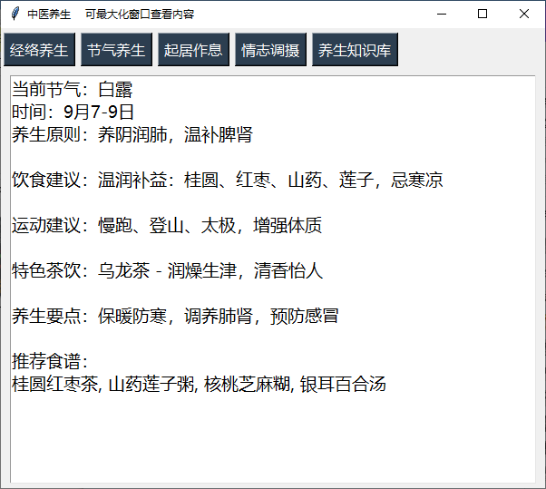 - 养生知识库:阴阳五行、饮食养生、季节养生原理。
