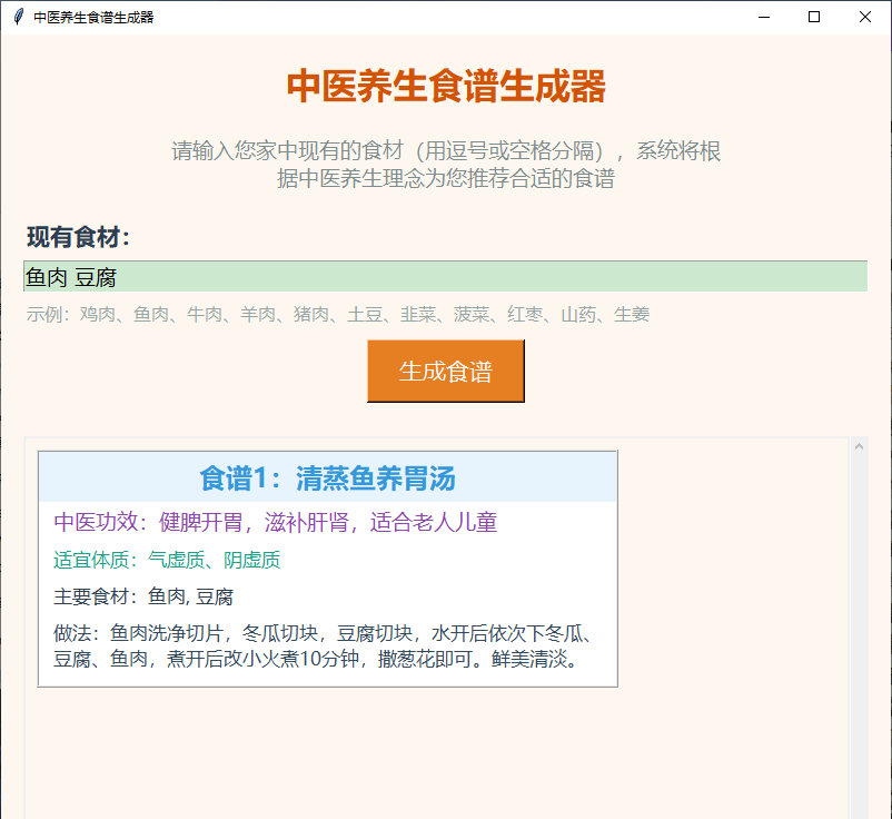 - 软件根据当前季节和星期生成个性化菜单,包括热量调整建议和营养提示。